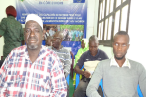 Grâce au projet d’appui au secteur privé Ivoirien, Financé par l’Union européenne, pour le renforcement des capacités de ce dernier dans les négociation de l’APV, le Coordonnateur adjoint, M. Gilbert KOUAKOU et Mr. DOH César, Président du SYNGOPIB, ont préparé ensemble la partie technique et animé l’atelier d’information et de sensibilisation des opérateurs du secteur privé de la Zone Ouest et autres parties prenantes, le 7 Juillet 2017 à Man.